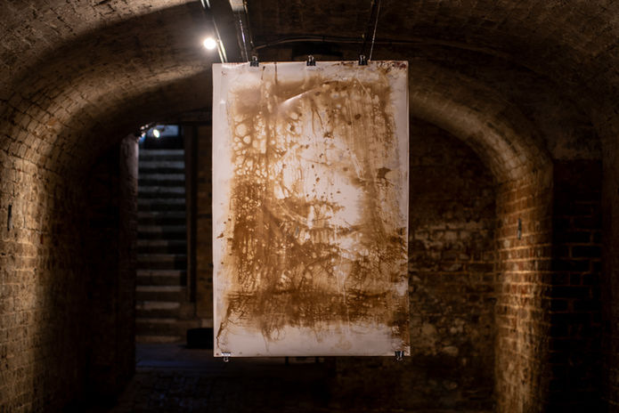 Using the dark quality of the Crypt and its humidity I exposed photographic paper using a tin pinhole camera , I created a darkroom where to experiment with chemigrams while also working on porcelain.